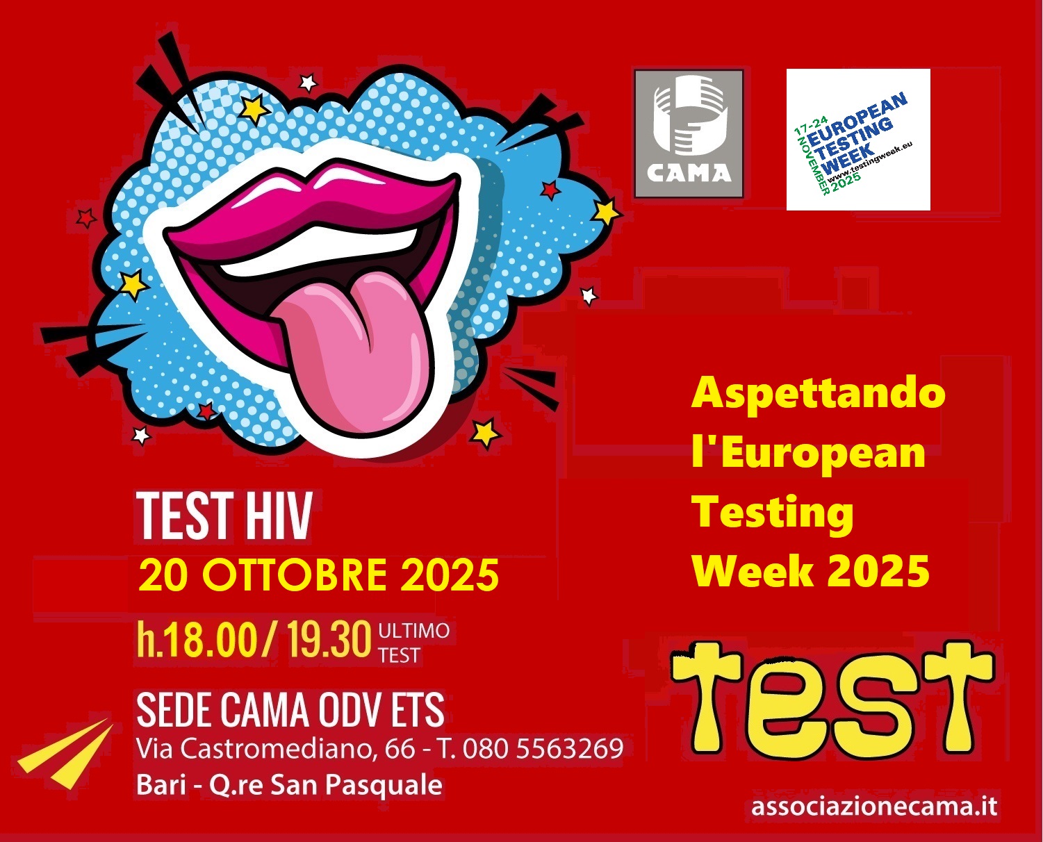 Lunedì 20 Ottobre, i volontari del CAMA, presso la sede operativa di Via Castromediano 66 a Bari, dalle ore 18.00 alle 19.30 (ultimo test), per promuovere la consapevolezza del proprio stato sierologico tra la popolazione, offriranno, a chiunque vorrà, test salivari HIV a risposta rapida, in modo anonimo e gratuito.