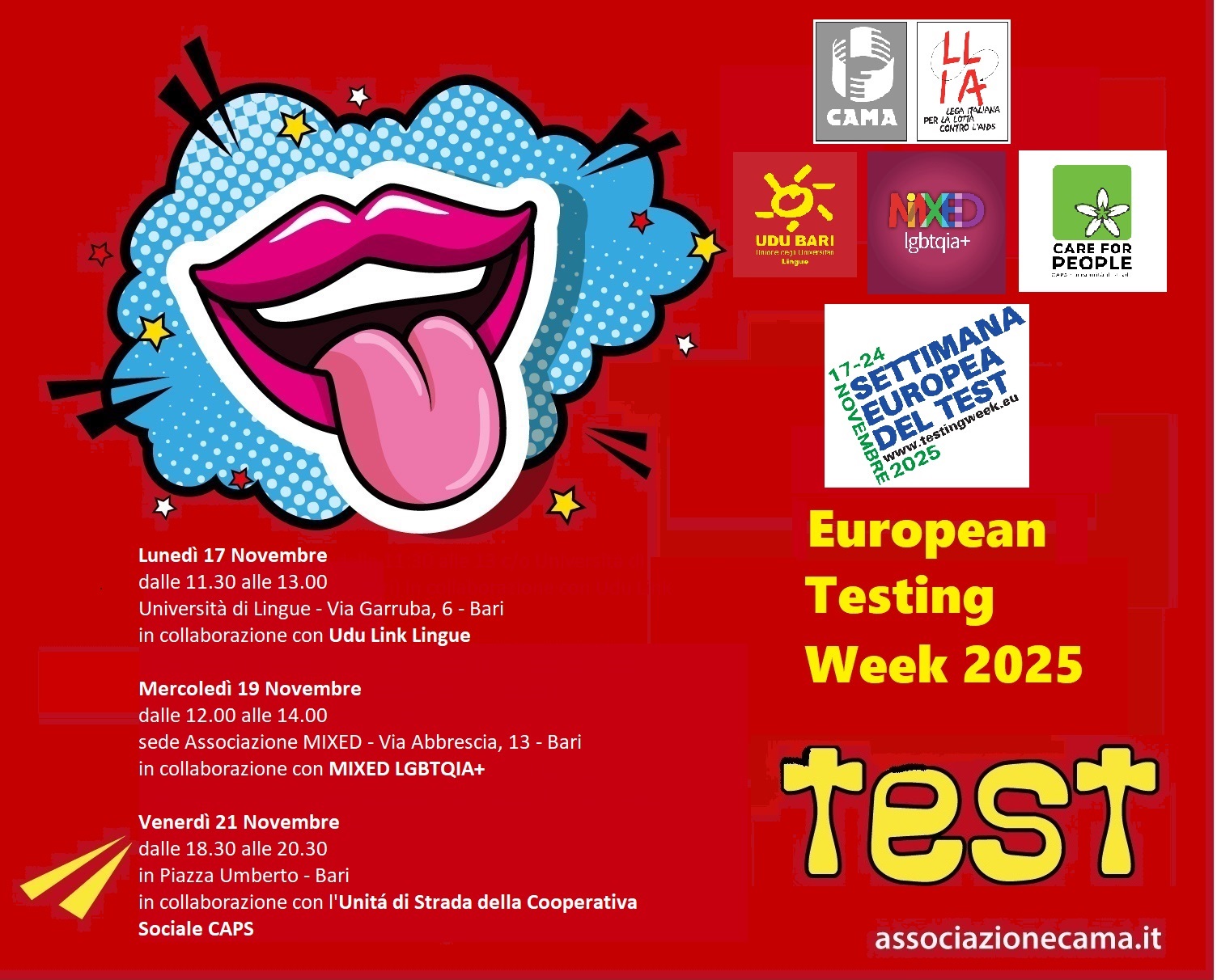Il CAMA e la LILA di Bari che da anni offrono servizi di Testing gratuiti e anonimi, quasi totalmente autofinanziati, moltiplicherà durante tutta la settimana l’offerta di test rapidi per HIV (salivari e capillari) e sifilide (capillari) con iniziative esterne. A coloro che si rivolgeranno ai nostri servizi di testing, saranno proposti colloqui informativi e counselling pre e post test. In caso di esito reattivo le persone saranno sostenute e accompagnate nell’accesso ai servizi pubblici per gli eventuali esami di conferma, per la presa in carico e per l’accesso alle terapie. Ogni incontro diviene, comunque, una preziosa occasione di prevenzione e informazione centrata sulla persona e sulle specifiche esigenze di ciascunə.